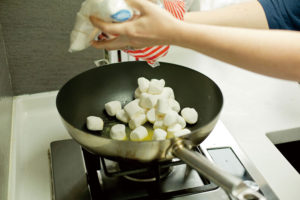 - In a large pot or wok, melt butter and 10 oz marshmallows, while stirring constantly, until combined and smooth. 在一口大锅或炒锅中,将黄油和10盎司的棉花糖熔化。在熔化的过程中不断搅拌,直至棉花糖和黄油均匀地融合在一起。