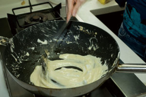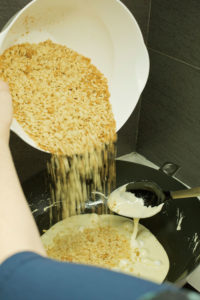 - Reduce to a simmer and add the Rice Krispies and crumb mixture to the pot and stir until combined. 将火调至煨炖状态,加入米香麦片和饼干的混合碎屑,搅拌至锅中的混合物完全融合。