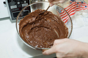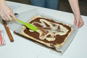 - Pour the melted chocolate on top of the pressed Rice Krispies crumb mixture, completely covering the mixture. 把熔化好的巧克力倒在铺好的米香混合物表面,将巧克力完全覆盖混合物。
