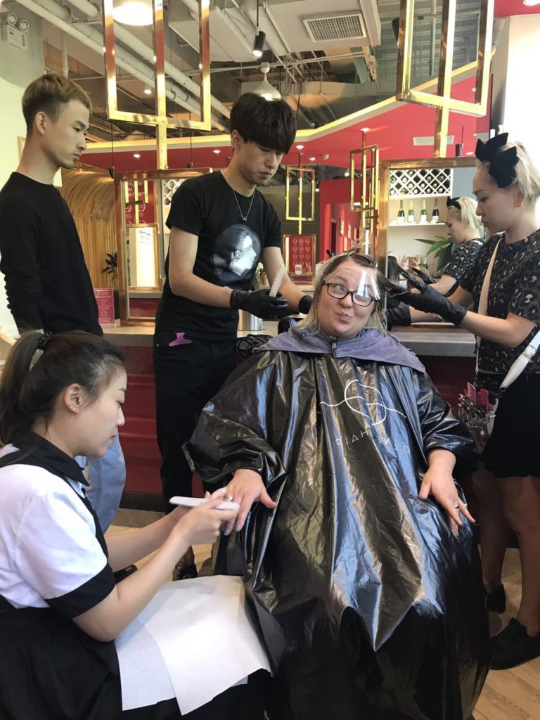 I head to Blow+Bar in Sanlitun for a Mother’s Day pampering. The salon has a red, sleek and clean interior, with jazz sounds creating a relaxing space to get your hair done. I meet with the salon owner and she explained the treatment. Our hair has keratin in it already, but because of hair coloring and the elements, it leaves our hair. This special treatment will restore the keratin in my hair, adding volume and sleekness to my frizz.