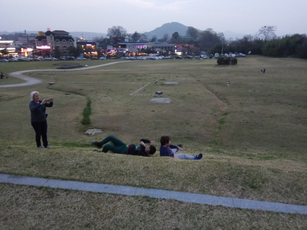 From the bus station we headed out to Buyeo, one of Korea’s oldest cities. Like China Korea had a “Three Kingdoms” period, and Sabi Fortress, as the town was known then, was the capital of Baekje, which dominated the south-west of the peninsula. There are many historical sites there, but our first impression was one of a peaceful, slow-paced town, where the air is clean and there’s space for kids to play. The contrast with Beijing was marked and refreshing, and my boys spent most of the first evening rolling down the hill by one of the temples.