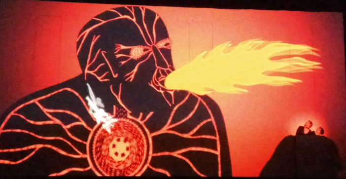 This Magic Flute though, developed by Komische Oper Berlin and British theater group 1927, is something very different. Most of the action consists of video animation projected onto the stage. If that sounds flat and artificial, then the actual experience is anything but. From the moment our hero Tamino appears running from a pursuing dragon, the interaction between performers and projections is lively, enthralling, and frequently hilarious.