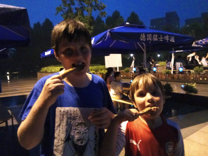 Like all proper barbecues, the food is cooked outside, and when we visited, nearly all the guests were eating outside, in spite of the enormous storm thundering over our heads. Indeed, the torrential downpour completely failed to quench the high spirits of a party of students from nearby Tsinghua University. Their hilarity was raucous but good-natured, and the other families in attendance joined in the party atmosphere as we did.