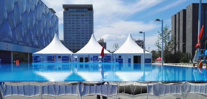 Relief is coming for China’s notoriously hot summers in the form of a new mobile public swimming pool that debuted on Tuesday right outside the National Aquatics Center.
