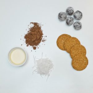 Crumble the biscuits till pulverized. Mix all the ingredients (except the coconut) together. Scoop the mixture with a ¼ cup of condensed milk and form into balls. Then roll them around in the desiccated coconut till they are equally coated.