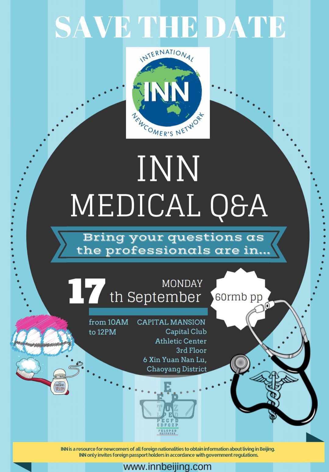 Adults. The International Newcomer’s Network (INN) General Gathering topic for September is their Medical Q&A, with a team of international medical professionals on hand to answer all the questions you may have about any health-related concerns. The best part of this gathering is you don’t have to make an appointment to talk to the professionals. RMB 60. 10am. Capital Mansion Athletic Club. (WeChat ID: INNBeijing1994, 138 1170 5071)