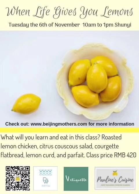When life gives you lemons, lemonade is just the beginning of the delicious things you can make. Learn all about the magical citrus fruit, the lemon, with Pauline’s Cuisine on Tuesday, November 6. You’ll make and eat roasted lemon chicken, citrus couscous salad, courgette flatbread, lemon curd, and parfait. Adults. RMB 420. 10am-1pm. V-Etiquette. (WeChat ID: paulus155)