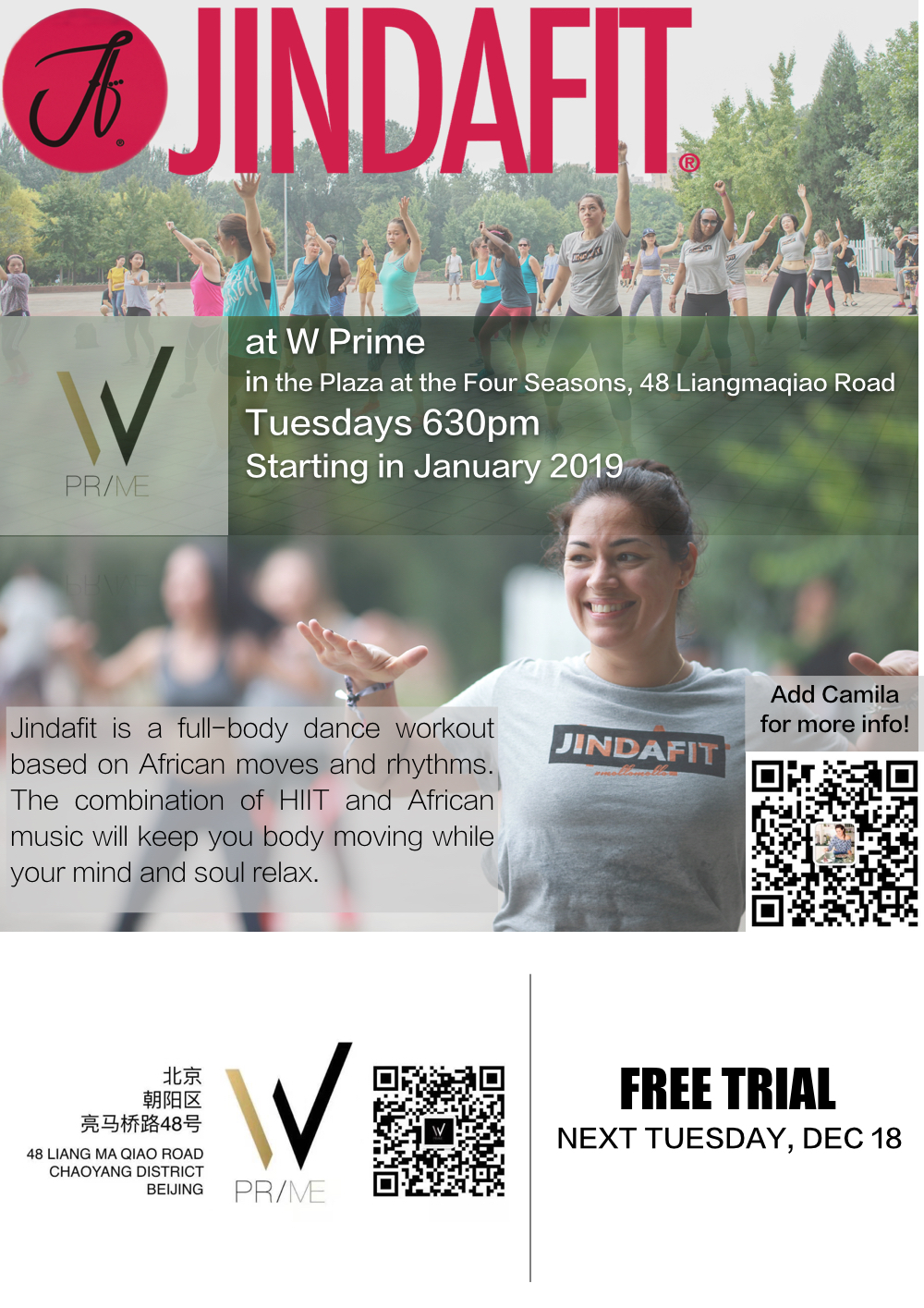 Jindafit coach Camila Betin is now offering a free trial of her class at W Prime, Four Seasons Hotel, which in the New Year will roll out to weekly classes every Tuesday at the Hyatt. For more information on classes and locations check out www.jindafitness.com or WeChat: Djacklamusique. For now, it’s time to get fit and celebrate life with a trial class.