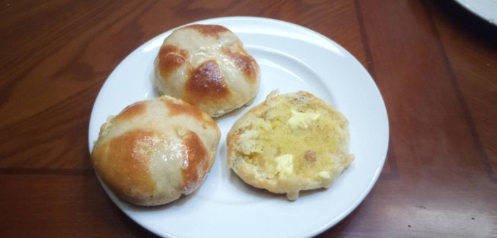 More importantly, they were delicious, split open and buttered hot from the oven: not as sweet as commercial buns, even with the honey glaze, but fruity and richly textured. Enjoying one with a cup of tea, I was able to relax and consider the deeper questions of life. Such as, what kind of fool would buy a hot cross bun for a penny when you can get two for the same price?
