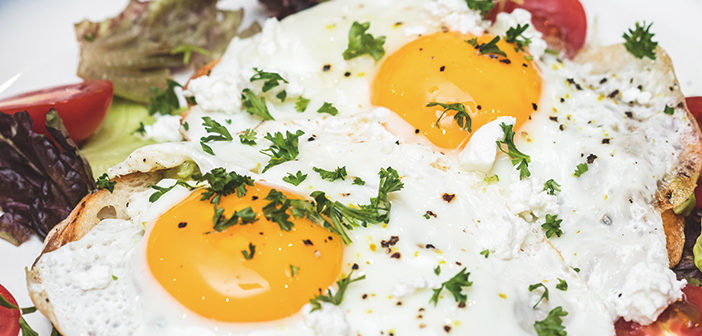 5. Top the toast and avocado with your fried eggs, season to your liking, and garnish with chopped spring onion and crumbled feta or goat’s cheese.