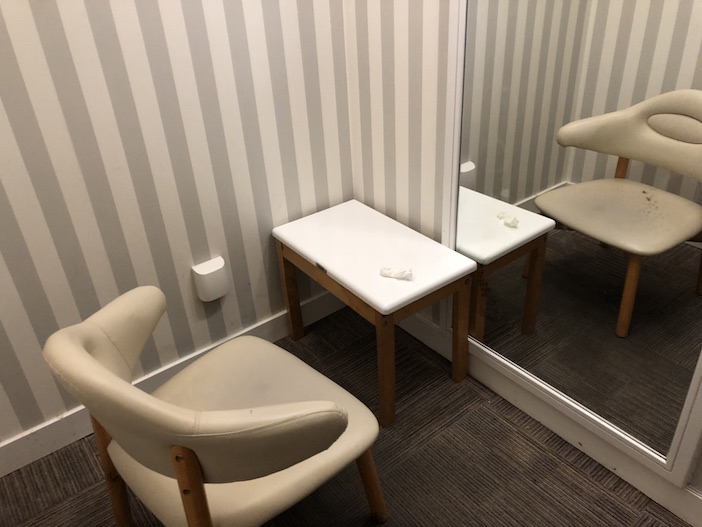Who decided that putting a nursing room between a giant shop and an elevator bank was a good idea? Also passersby, thanks to the translucent frosted glass walls, will see your silhouette while you’re trying to nurse in privacy. On top of that, the door has no lock, so the only item standing between you and a gross lack of privacy is a measly curtain.