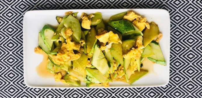 - Add the rest of the peanut oil and garlic. When the garlic is aromatic, add the slices of cucumber. Stir-fry until slight soft and add the fried egg.