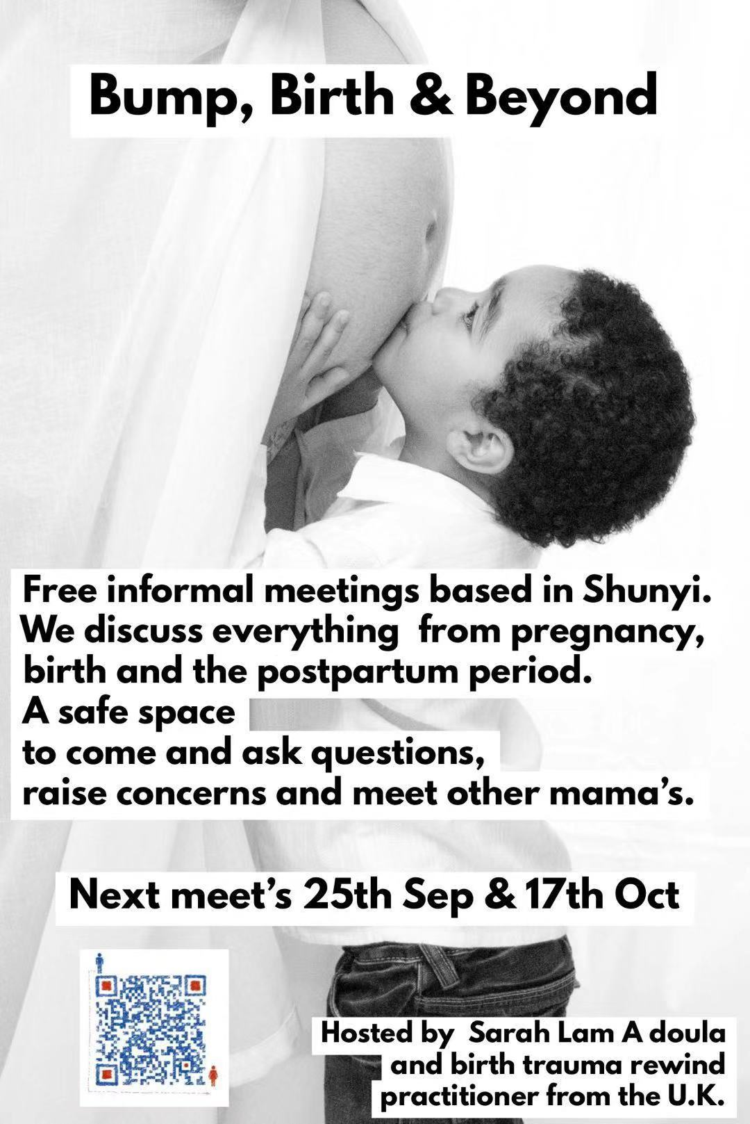 As a mother of four, a doula, and a birth trauma rewind practitioner, Sarah Lam has both personal and professional experience which she shares with other mothers during free, informal monthly meet-ups at her home in Shunyi. The next two will be held on Sep 25 and Oct 17 from 10am to noon. Due to privacy concerns, Lam does not make her address publicly available, but will be happy to provide you with it if you choose to participate. She can be added on WeChat using the QR code on the flyer below.