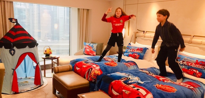 Upon opening the door to our adjoining rooms on the 18th floor of the China World Hotel, the first thing that hit me were the bright colors! Hotels are notoriously neutrally decorated and for good reason, so they are calm & clean looking, but this was a happy surprise. We were welcomed by a tiger-tent filled with ball-pit balls and bright orange Winnie the Pooh pillows. The next room was filled with Cars’ Lightning McQueen bedspreads, pillows, towels, and a tall pirate tent.