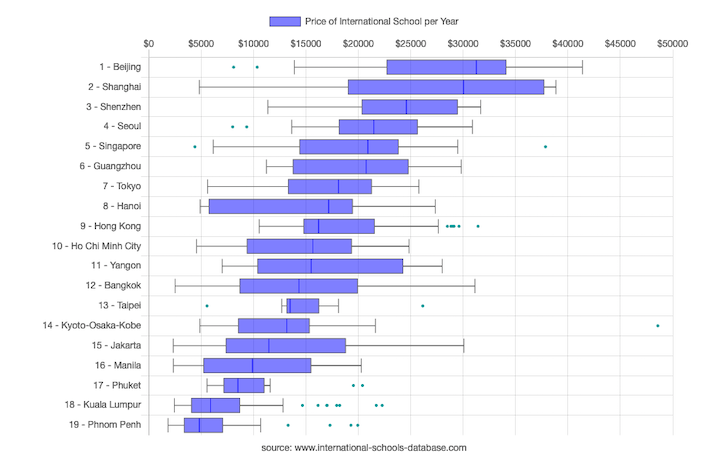 China ranked first as the country with the most expensive schools anywhere in the world. Asia, in general, leans more towards the expensive side with only Phnom Penh, Cambodia having an international school that charges less than around RMB 14,000 a year. Beijing and Shanghai, on the other hand, are leading the chart with the most expensive schools in the world at around RMB 290,000+ and RMB 273,000+ per year.