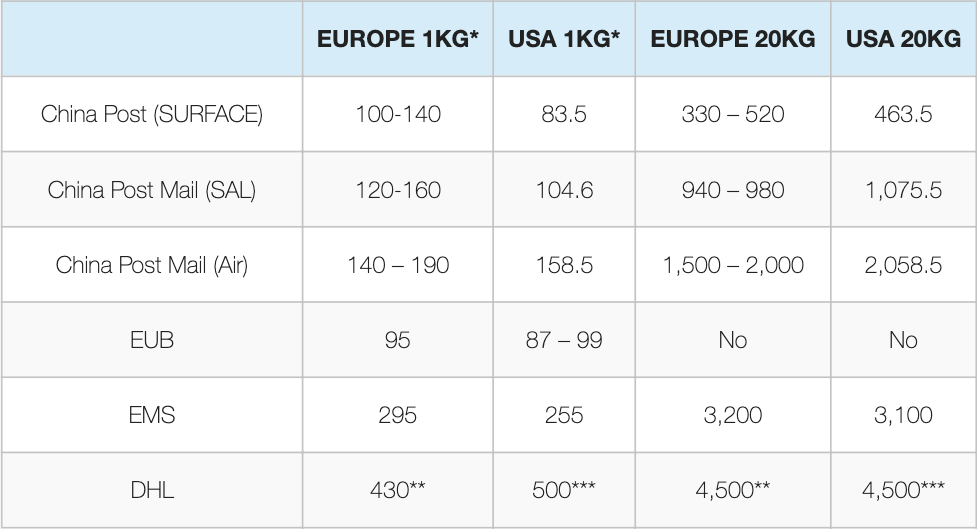 The third option is Express Mail Service (EMS), which is a globally recognized service that stitches together post offices across the world. They guarantee a seven day timetable, however they also tend to be one of the most expensive, with a 4.4 lb package costing RMB 630. This figure reflects a scale of RMB 240 for the first 500 grams with RMB 75 added for every 500 grams thereafter.