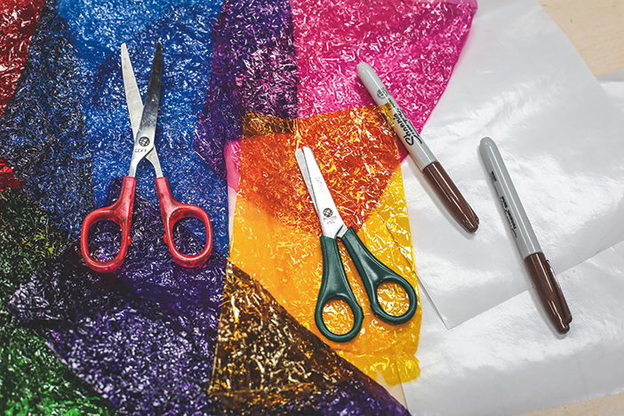3. Cut tissue paper into small pieces and layer the tissue paper pieces onto the clear contact paper. Don’t worry if you go outside of the outline, this will get trimmed off later!