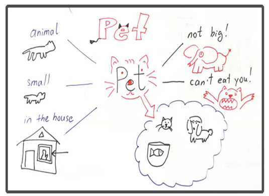 Mind Maps aren’t just for older students though. Very Young Learners (VYL), students who are younger than 5 years old, can also benefit. This example from an experienced VYL teacher shows how a Mind Map can introduce a new sub topic, Pets, and set it apart from the larger topic of animals.