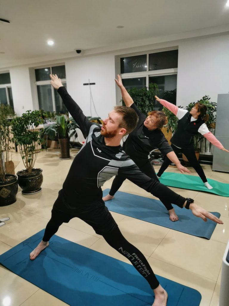 Jie Ge: I like sporting. My mother in law likes square dancing (广场舞). But last year she had an operation to both knees. So she joined me in the yoga to keep her body more flexible. Then, my sister-in-law saw my mom liked yoga and saw her progress, and she joined us too! I also have a friend of my brother who joins me for morning fitness.
