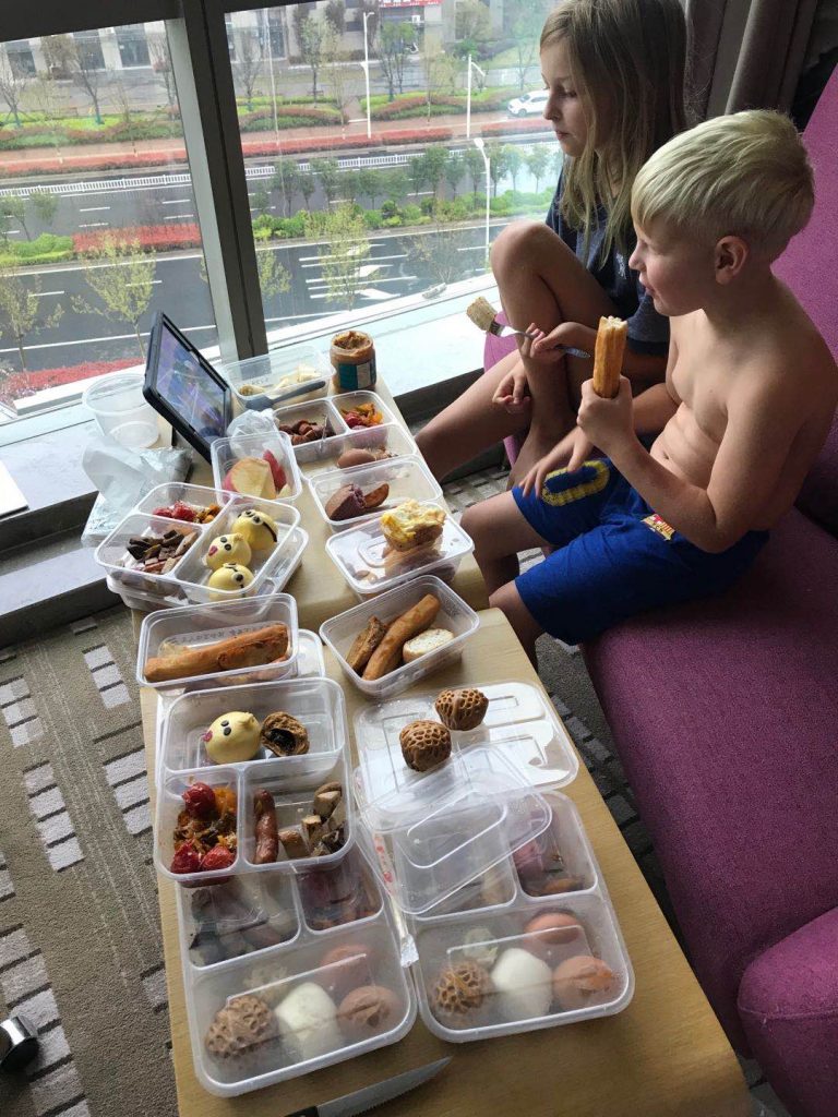 We were expecting to do our quarantine at home, due to the children. In that perspective, it is worse, but the hotel is nice and clean. It opened just a few months ago. We have two connecting rooms and two bathrooms, big TVs with some Western channels, and food is getting better every day. The first few days were only Chinese food, but now they are bringing us a bigger variety of food. Today, we had mushroom soup, pasta bolognese, and fruit.