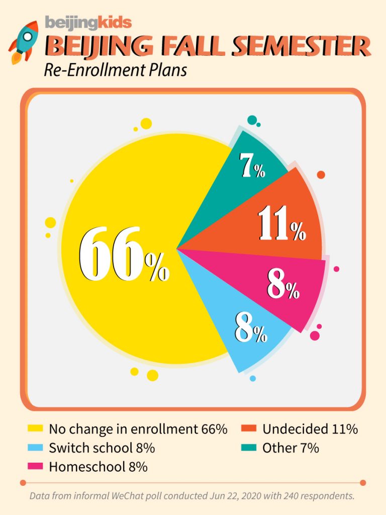 More than one in ten – 11% to be exact – are undecided as to re-enrollment. Some parents – 8% of respondents – are unhappy about how their school has handled the coronavirus crisis and are looking to switch schools. Another 8% have decided to homeschool their children for the next semester. The final 7% replied with ‘Other’ which could indicate they are considering leaving China entirely.