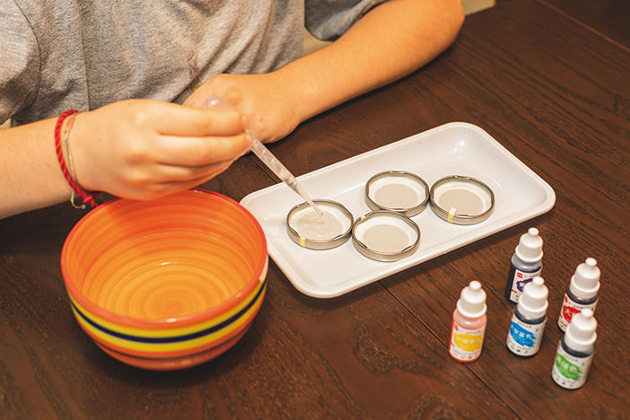 Put approximately two tablespoons water in a jar lid or other container, and add six to ten drops of food dye, then mix together. Repeat for as many colors as you want. You can easily adjust the amount of water and dye to your liking.
