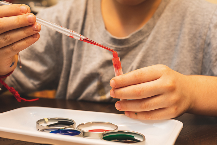 Use the pipette to carefully drop the dye onto the tip of the pen. Watch as it soaks up the colors! Alternatively, use a straw, putting one end in the dye, and blocking the other end to create suction.