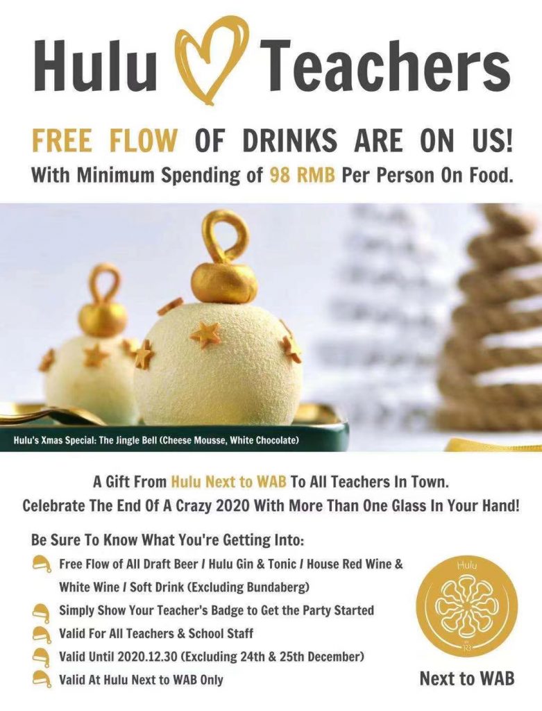 Man, our teachers need a break! That’s where Hulu at WAB comes in. We’ve already tried this place out and found it quite delicious — as expected — but from now through Dec 30 (with the exception of Dec 24 and 25), all teachers and school staff can be treated to free-flow drinks with just a minimum RMB 98 spend on food!