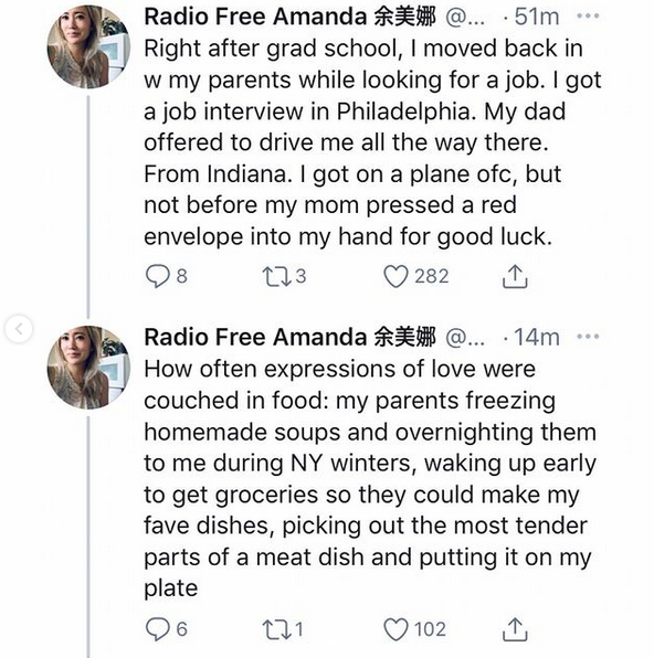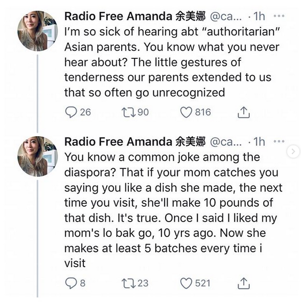 Radio Free Amanda continues to write “You know a common joke among the diaspora? That if your mom catches you saying you like a dish she made, the next time you visit, she’ll make 10 pounds of that dish. It’s true. Once I said I like my mom’s lo bak go, 10 [years]ago. Now she makes at least 5 batches every time I visit.” Following her post, the comments from other Asians came pouring in. Instagram user @deeebee wrote “Our Asian parents & grandparents were never taught how to express their love vocally, but each “small gesture” they made for me never went unnoticed. Do I wish it’s easier for us to say, “I love you” & “I’m proud of you”? Yes, but I will always appreciate the things they’ve done for me throughout my life. It’s those memories that I will always cherish.”