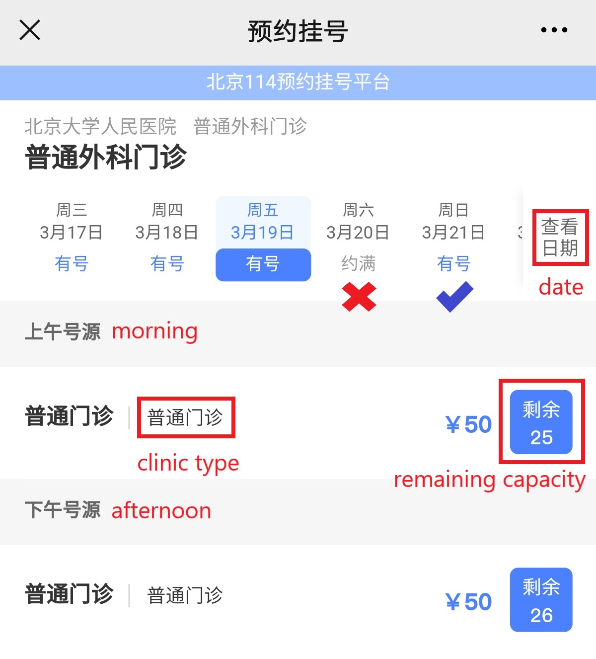 Step 5, let’s take general surgery department as an example. Choose the date by sliding left or right, or use the calendar. The date with color blue still has empty places for registration. The gray one means all places are booked. The below part shows the available places for morning and afternoon.