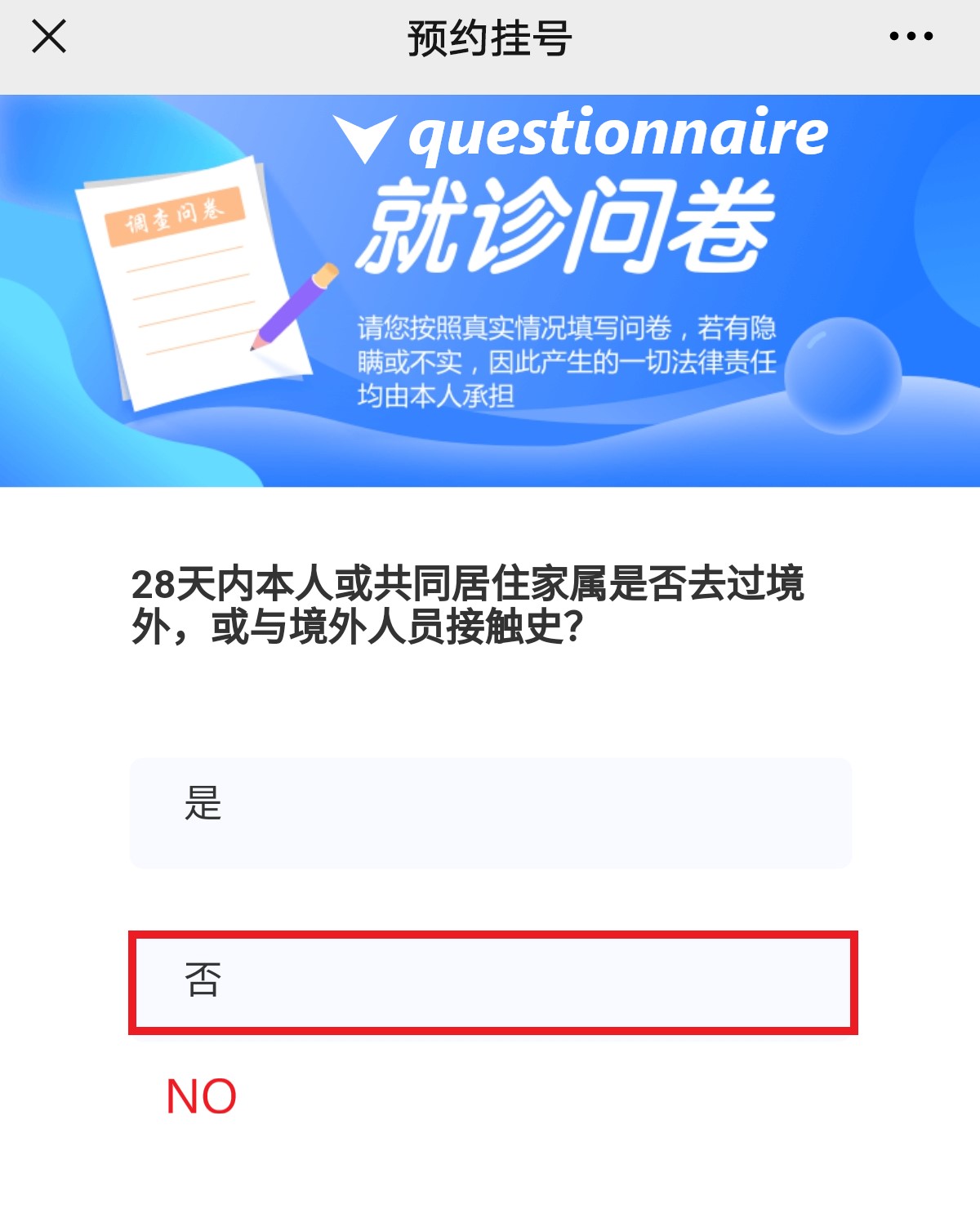 Step 7, during the COVID period, most hospitals require patient to complete a questionnaire. If you don’t have any symptoms of fever and have no history traveling to middle or high risk area, just click “no” for all the questions.