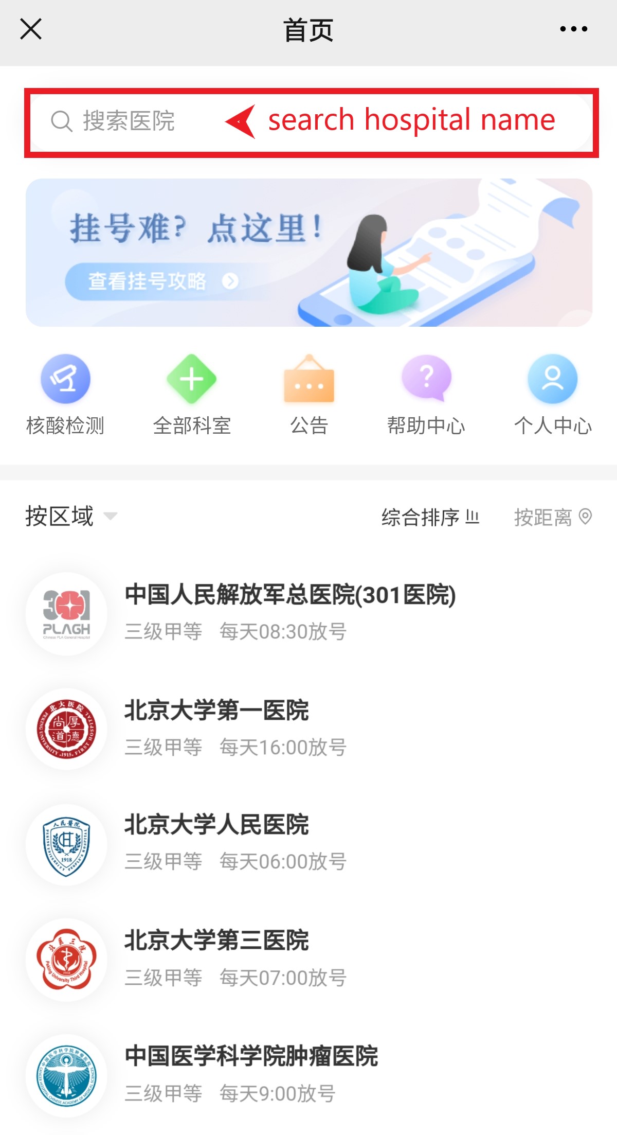 Step 3, search the hospital name at the top bar or slide down the list to find the hospital you want to visit. Then enter the hospital page.