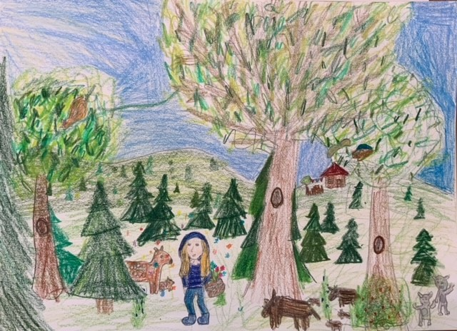 “Oh no!” said her mother. “I haven’t got time to pick some flowers for granny. Would you please leave the path on your way to granny’s house to pick some flowers?” Her mother reminded her: “Don’t forget: Be nice to everyone you meet on your path. Granny has many animal friends in the woods.”Of course mummy, l would love to!”