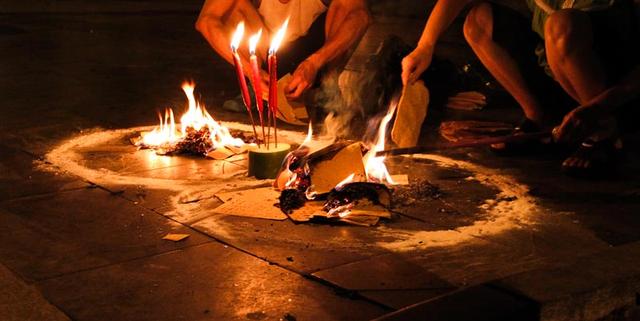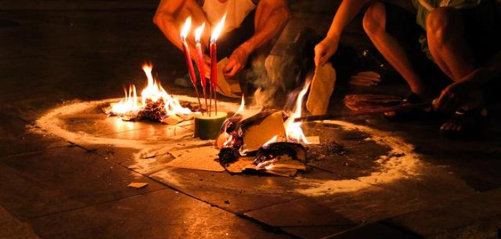 People burning papers at intersections are those with recently departed loved ones (meaning siblings, parents, grandparents, etc.). It’s not very common for people to burn papers for their ancestors from a few generations ago. A circle is drawn on the ground and food to honor the departed is placed in plates next to the circle. Then incense is lit and placed alongside the circle. Before the official paper burning for your loved ones begins, you need to place a smaller plate of offering food and burn a small amount of paper money outside the circle for the passing ghosts. This is so that the passing ghosts will be satisfied and not grab the things intended for your loved one. Think of it as a ghost tax. Once that paper burns out, you can begin. Start by saying your loved one’s full name and tell them to get ready to receive money and goodies. Then start burning.