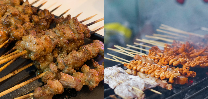 Isaw – a popular street food delicacy in the Philippines – is made from pig or chicken intestines. Prior to being served, isaw is repeatedly cleaned and turned inside out, then barbecued on a grill, and finally, becomes the zig-zag treat on a stick you see before you. In my opinion, street food can’t get better than this. Or can it? Isaw can easily be compared with its Chinese cousin from Xinjiang: yang rou chuan’r, or lamb skewers in English.