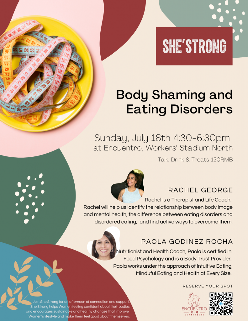 She’Strong presentation on “Body Shaming and Eating Disorders” takes place this Sunday from 4:30-6:30pm at Encuentro, Workers’ Stadium North. Tickets cost RMB 120. Scan the QR code below for more details!