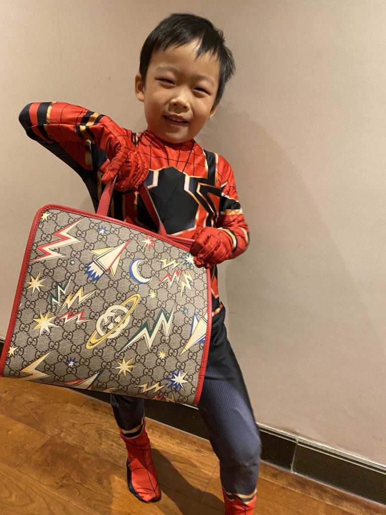 Val’s mother Shu was tired of lugging around a childish kid’s bag for her son whenever they went out, so she decided to upgrade to this small space print Gucci tote for children. Turns out, Val loves it just as much as she does, if not more! Watch Val introduce us to the contents of his Gucci bag in the video below or keep reading: