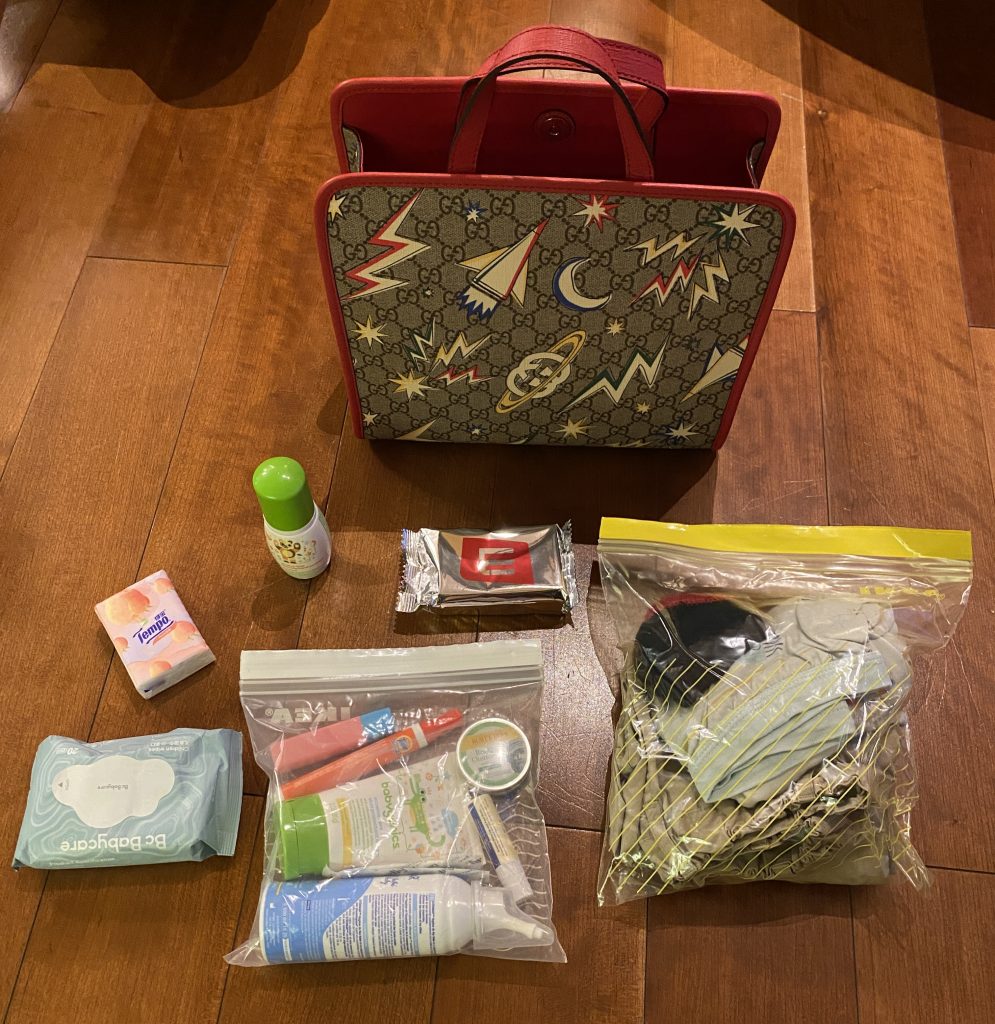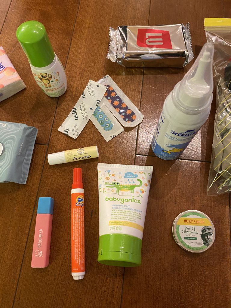 “Inside my bag I got peach tissues. Lulu chocolate cookies that are very good. A bag of clothes if I pee my pants *gesturing to a zip-loc bag containing toiletries*. This is my something that I need to blow in my nose (saline nose spray), some lotion, some anti-itching balm, some boo-boos if I’m hurt (band-aids). A stain pen, a lip balm, a sanitizer to sanitize. And the last thing is the wipes.”