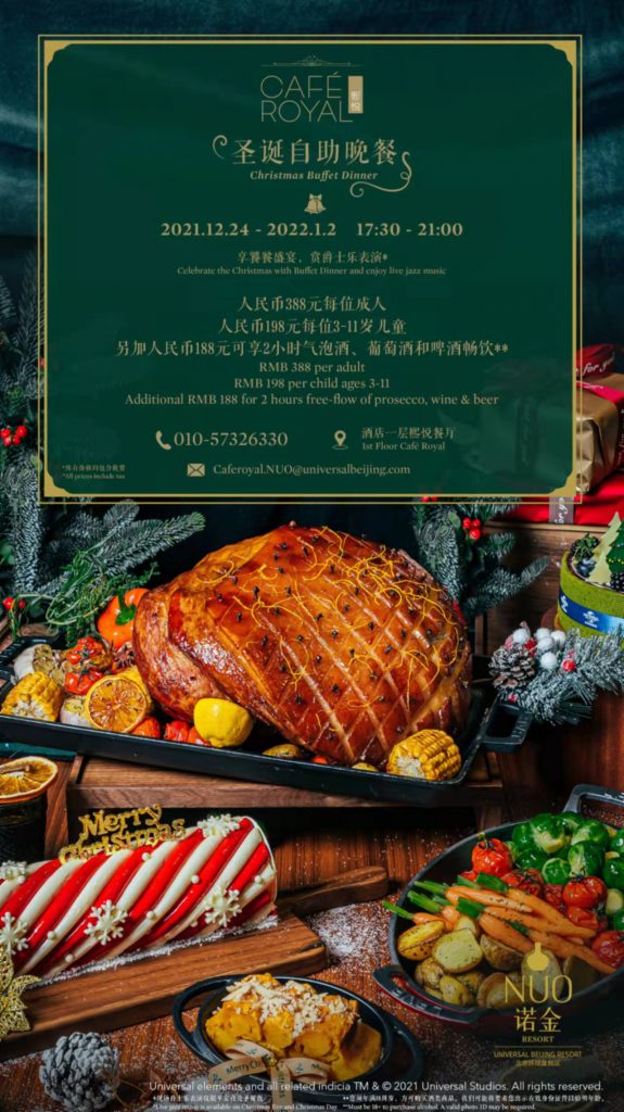 Help yourself to the scrumptious Christmas buffet dinner at Cafe Royal of the Nuo Resort Hotel at Universal Beijing on Christmas weekend and you’ll be treated to a dose of Santa himself! While the Christmas buffet will be available starting from Christmas Eve through Jan 2, Santa will only be making his appearance during the big holly jolly weekend, so be sure to secure your spot for Dec 24 or 25 if you want to lay eyes on the man of the hour! For more information, use the contact info in the poster below.
