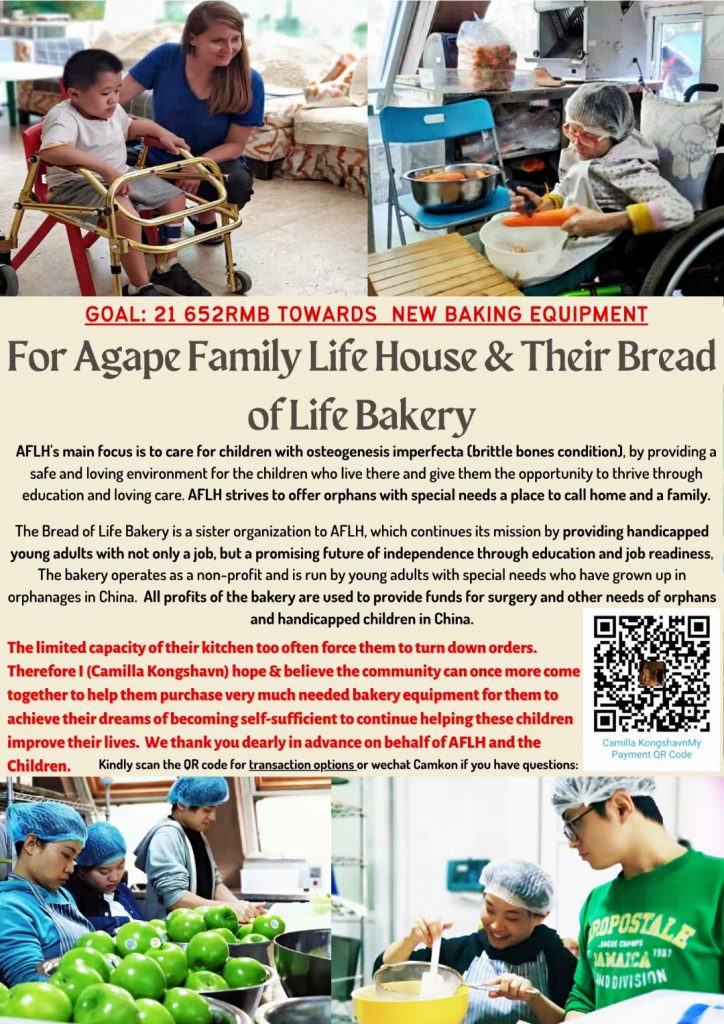 “Calling for help! For Bread of Life Bakery, a bakery unique to any other and I believe we together will be able to help them realize their dreams faster. They are a non-profit bakery, not only supporting the special need orphans at Agape Family Life House, but this bakery is run by handicapped young adults. When I first found out about Bread of Life Bakery I couldn’t stop myself from reading more about them. I contacted them directly to find out how we in any way could help them make life easier. For them to operate their bakery more efficiently they have items on their wish list that would help them immensely. I’m Hoping we together as a community can collect the needed amount and purchase this for them. If you have any money to spare, please consider a donation through the flyer with options for both WeChat and Alipay, any amount is of matter and we thank YOU for the care and support!”