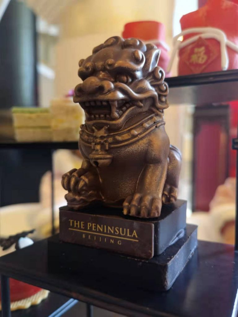 The afternoon tea set is beautiful and instaworthy on its own. There’s a combination of sweet and savory items but the highlight has got to be the chocolate guardian lion 石狮子 shí shī zi centerpiece. In fact, it took a few moments for us to realize that the sculpture – essentially a giant block of solid chocolate that’s molded and painted to look like a bronze lion sculpture sitting on top of a posh Peninsula base – was entirely edible.