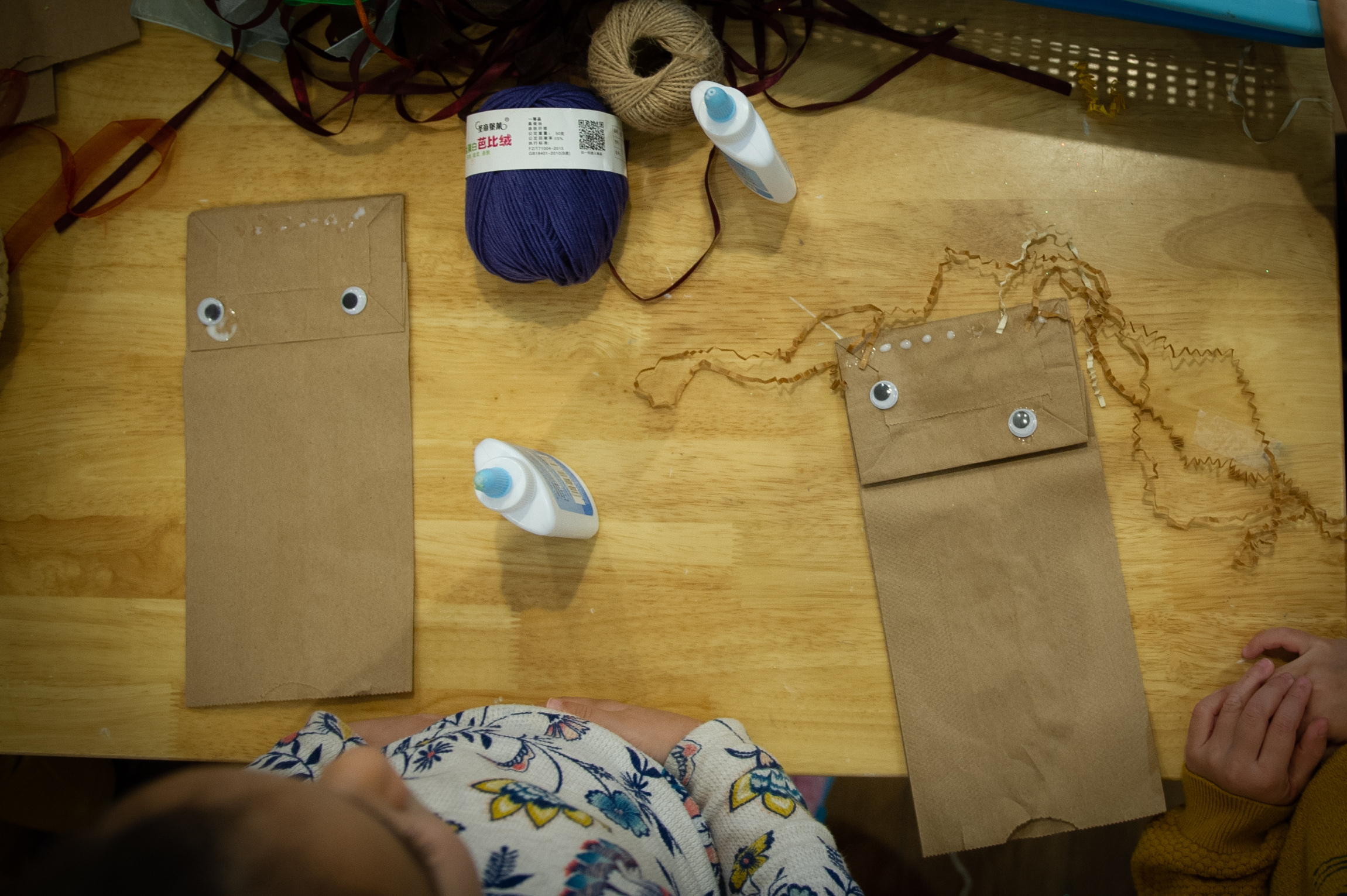 Take your paper bag and glue your puppet’s eyes on. Be sure not to add too much glue!