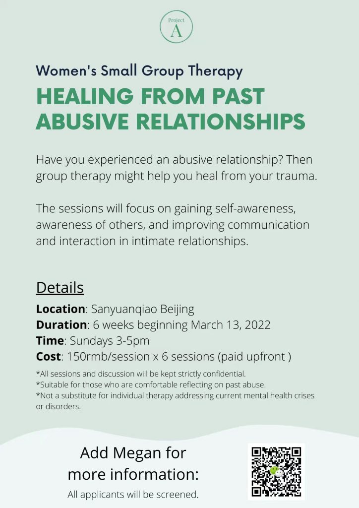 Megan is organizing a Women’s Small Group Therapy session with licensed therapist Xiaojie that focuses on “Healing From Past Abusive Relationships” starting Mar 13. The sessions aim to help participants gain self-awareness, awareness of others, and improve communication in intimate relationships. Through various fundraising efforts since December 2021, Megan has made it possible for participants to only pay a minimal fee of RMB 150 per session, with a total of six sessions to be paid upfront. For more details, scan the QR code above.