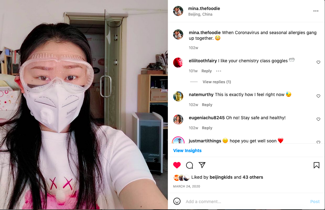 In 2020, at the beginning of the Covid outbreak, I was pregnant with my daughter, and I literally walked around Beijing with chemistry class goggles, multiple face masks, and (not pictured) rubber gloves. I managed to avoid any major allergy symptoms but also felt like I had kinda lost my mind at the same time. When I told this to Dr. Gary, he, in his very non-judgemental way, made it clear that the goggles and gloves were unnecessary. According to Dr. Gary, unless you touch pollen then immediately proceed to touch your eyes, it’s not going to make a difference.