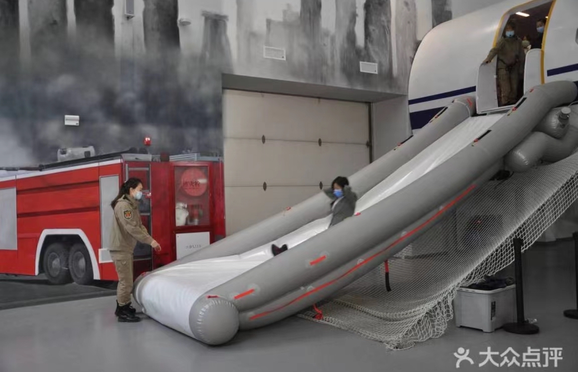 But here in Beijing, there’s a place where kids learn the essential emergency safety procedures and can actually get some first-hand demonstrations of how they work. From escaping from a sinking car to jumping onto the inflatable evacuation slide on the plane.