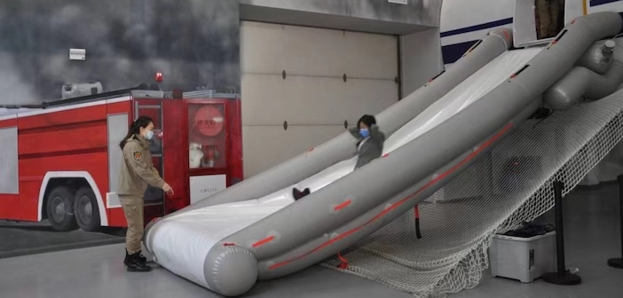 But here in Beijing, there’s a place where kids learn the essential emergency safety procedures and can actually get some first-hand demonstrations of how they work. From escaping from a sinking car to jumping onto the inflatable evacuation slide on the plane.