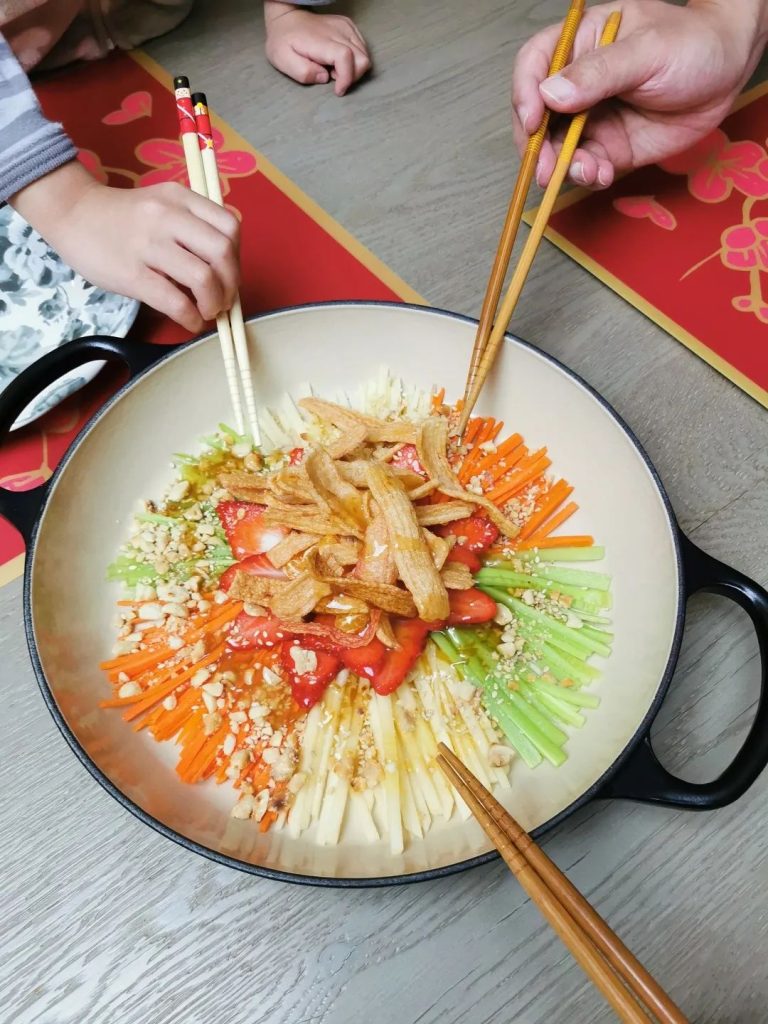 On the seventh day of the Chinese New Year, which is known as 人日 (Rén rì) meaning it’s everyone’s birthday! We celebrate with a Prosperity Toss (Lou Sang) – a symbol of abundance, prosperity and vigor! This is our homemade version of the Prosperity Toss.