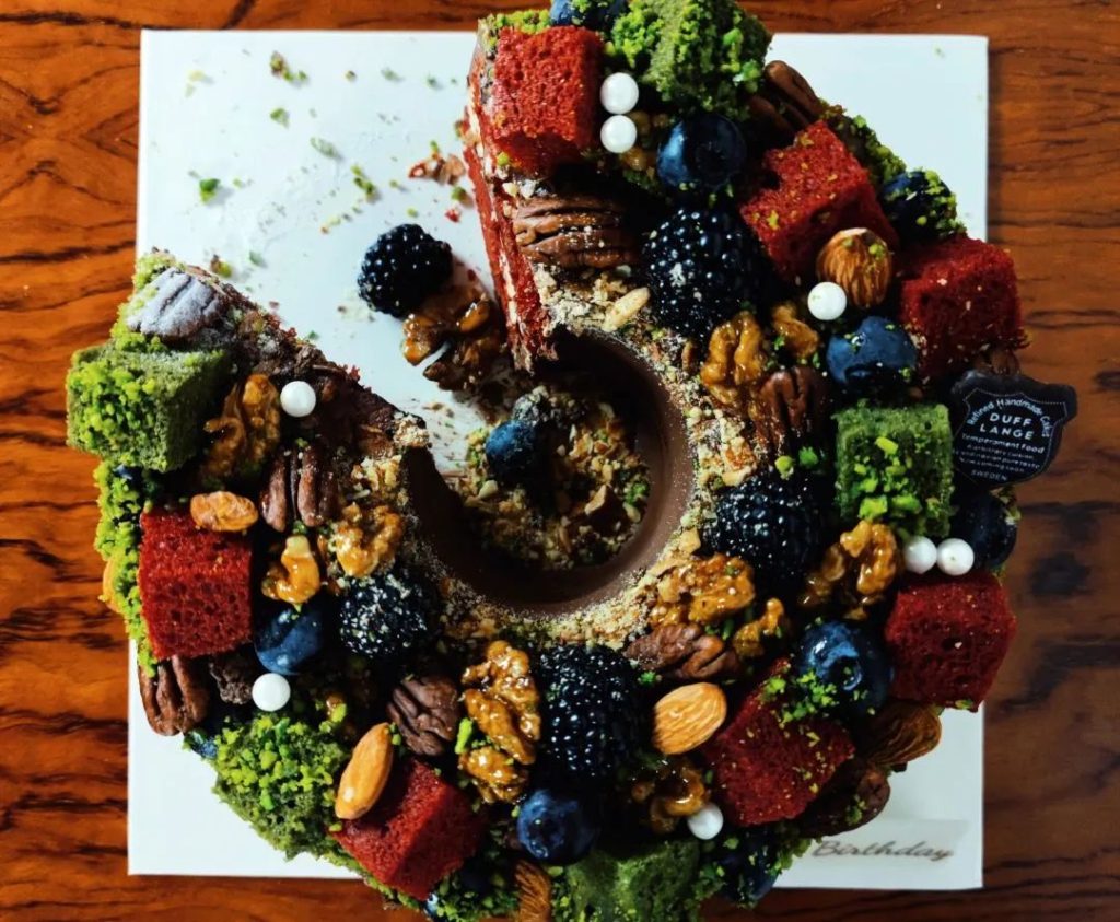 This is a photo of a cake from Duff Lange on our dining room table. We were celebrating a family member’s birthday and an early Christmas (suggested by the cake’s color scheme). The cake was one of the best I ever had! Though whether a cake can be considered a meal is certainly a discussion, I can guarantee that eating a slice of it felt like finishing an entire meal! Its color, rich taste and sheer size says it all.