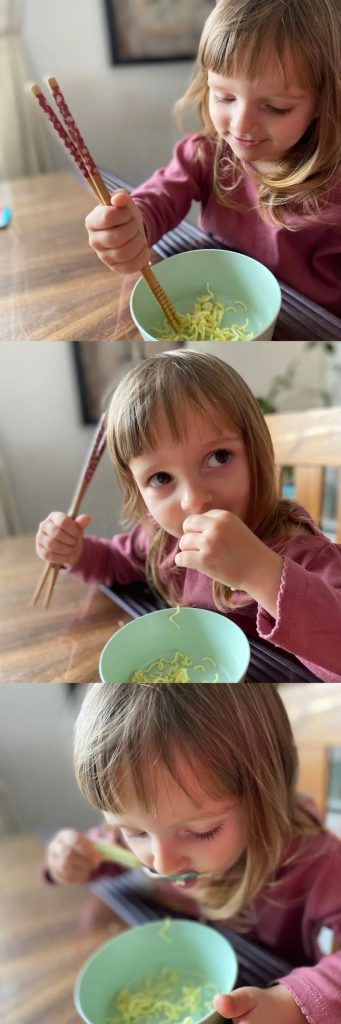 For our family, some of our best memories around food have been on the road and a bit more transitional than the normal sit-down dinner. Here, my littlest (Sofia, 2.5 years old) is learning how to use chopsticks for the first time – or not.