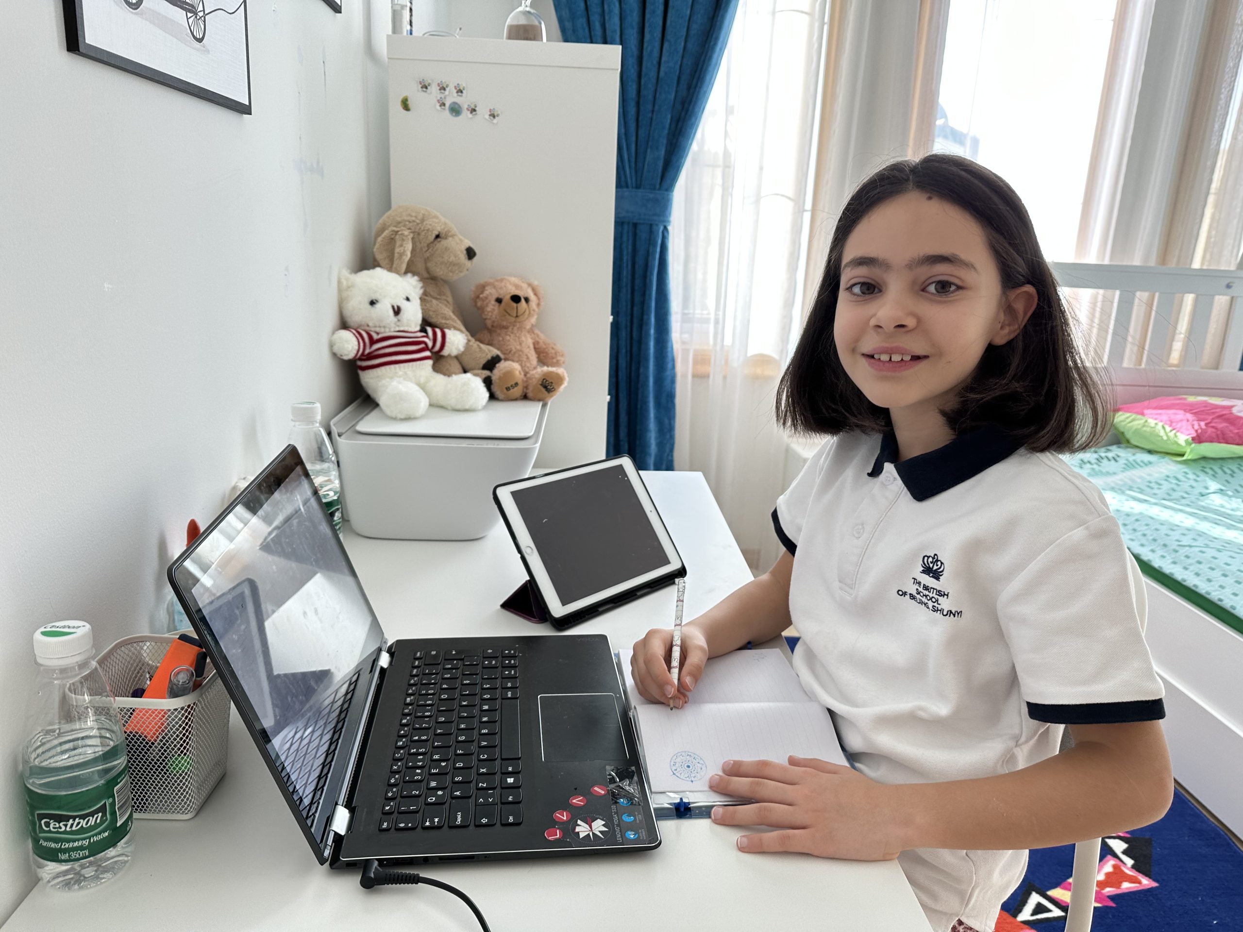 “I’m excited to see my friends and teachers in the morning every day,” says 9-year-old Grade 5 student Ayşe Nil from British School of Beijing (BSB) Shunyi. “I adjust my alarm every day, but I wake up before the clock rings. The increasing number of Covid [cases]worries me. I feel safe at home and I do not interrupt my education. I also experience digital learning ways. I take care of my cat, Cookie, between classes. She sleeps next to me while I study. My play room is now my online classroom. I know I will be going back to school again and I look forward to these days with confidence.”
